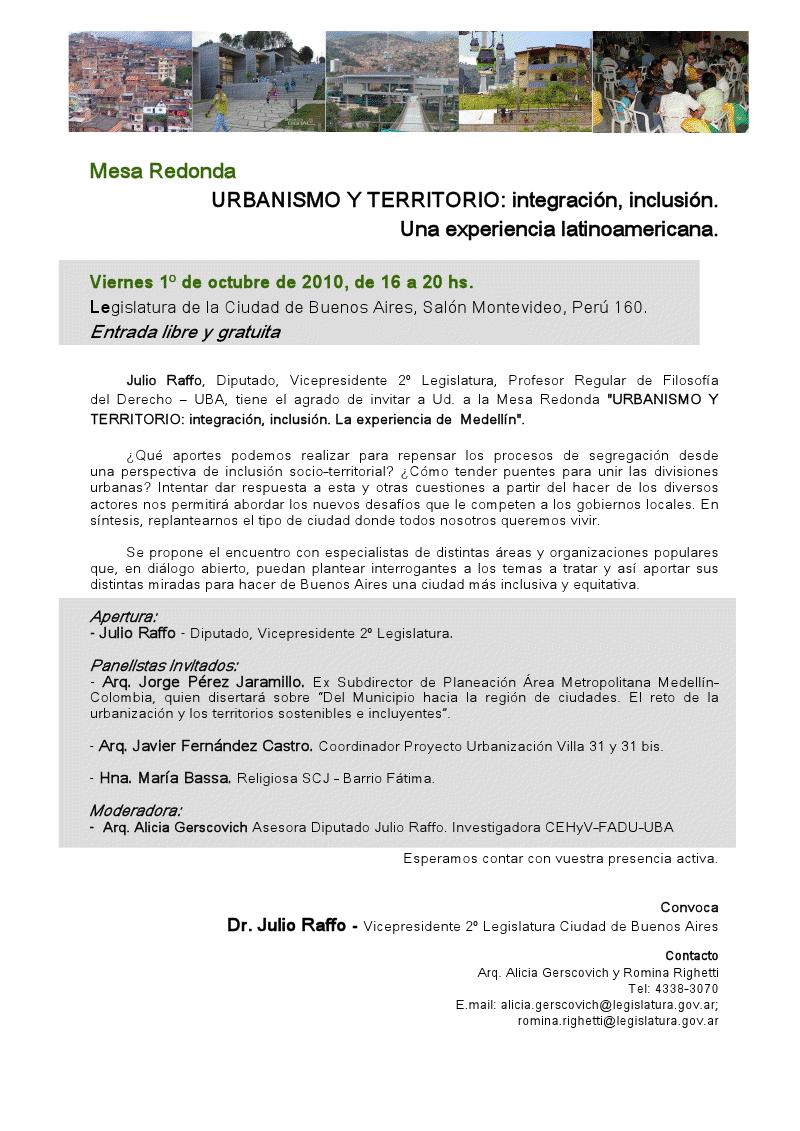 El viernes 1ª de octubre a las 16 hs. en el Salón Montevideo de la Legislatura de la Ciudad de Buenos Aires, Julio Raffo – Diputado, Vicepresidente 2ª – convoca a la Mesa Redonda sobre “URBANISMO Y TERRITORIO: integración, inclusión. Una experiencia latinoamericana”.