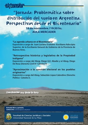 La Secretaría de Extensión Universitaria tiene el agrado de invitarlos a la Jornada “Problemática sobre distribución del suelo en Argentina. Perspectiva desde el Bicentenario” a desarrollarse el día jueves 18 de noviembre a las 19:30 hs. en el Aula Mercader - Planta Baja - de la Facultad.