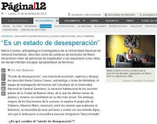 Cristina Cravino de la UNGS ha sido entrevistada por Página 12, contando sobre los procesos de exclusión de los sectores populares en la Ciudad de Buenos Aires y la falta de políticas habitacionales que den respuesta a las necesidades habitacionales de esos sectores, hechos que conllevan, entre otras cosas, a explicar la existencia y fuerza de las tomas de predios y terrenos.