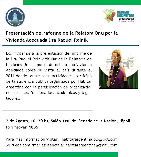 Les informamos que lamentablemente la Presentación del Informe de la Relatora Onu por el derecho a la vivienda Adecuada Dra Raquel Rolnik que estaba programado para el 2 de Agosto ha sido SUSPENDIDA, dado que por motivos personales no va a poder viajar al país.