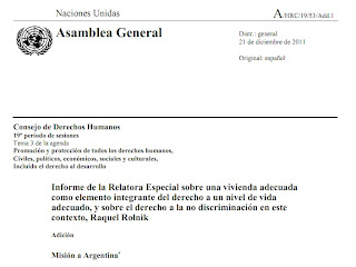 Informe de la Relatora ONU de Vivienda Adecuada sobre su misión a Argentina en 2011
