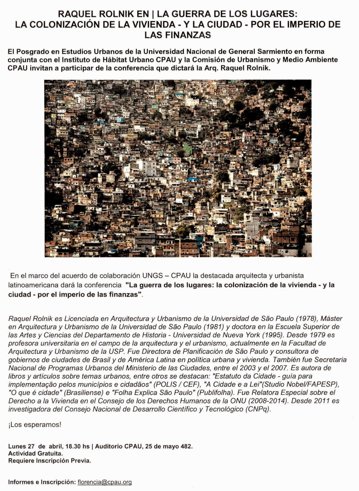 A las 18:30 Raquel Rolnik brindará la conferencia La Colonización de la vivienda y la ciudad por el imperio de las finanzas, en el Auditorio CPAU, 25 de mayo 482 más info.
